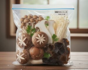 きのこは生のまま冷凍することで、細胞が破壊され、旨味成分が凝縮されます。買ってきたらすぐに石づきを取り、使いやすい大きさにカットしてから保存袋に入れて冷凍庫へ。使うときは凍ったまま調理できるので、時間がないときにも便利です。