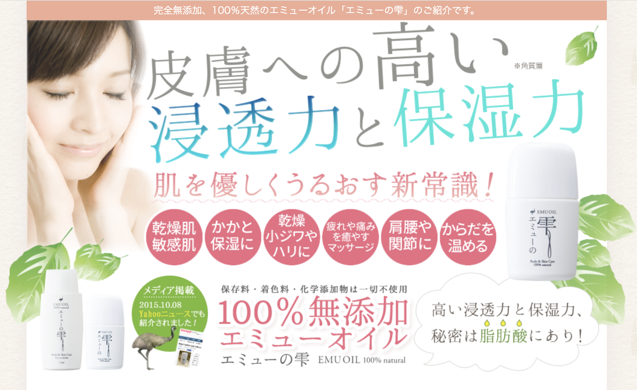 そんな時に頼りになるのが、100%天然無添加エミューオイル「エミューの雫」。